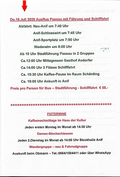 Anmeldungen zu den Ausflügen nur bei Obmann Hans Ramsauer - Tel.: 0664/1004411